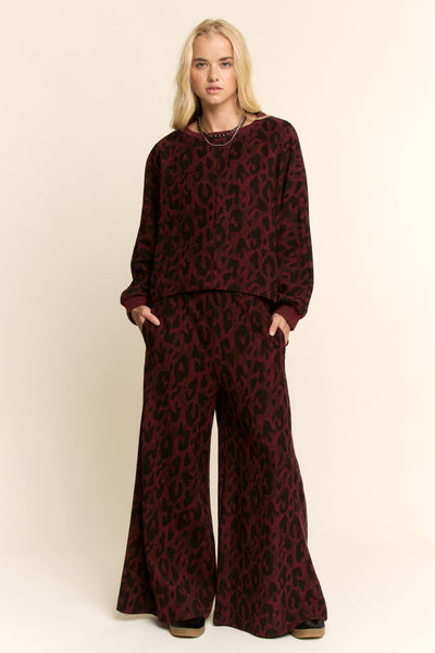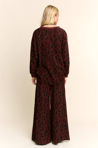 Make a bold yet refined statement with this burgundy leopard lounge set. Featuring a relaxed high-low hem top and wide-leg cropped pants, this matching set balances comfort and contemporary style. A standout wholesale piece for boutiques, it offers effortless versatility from laid-back days to chic casual outings.