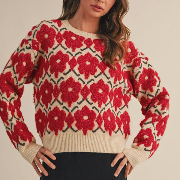 + Floral pattern in fuzzy knit + Ribbed neckline, cuffs, and hem