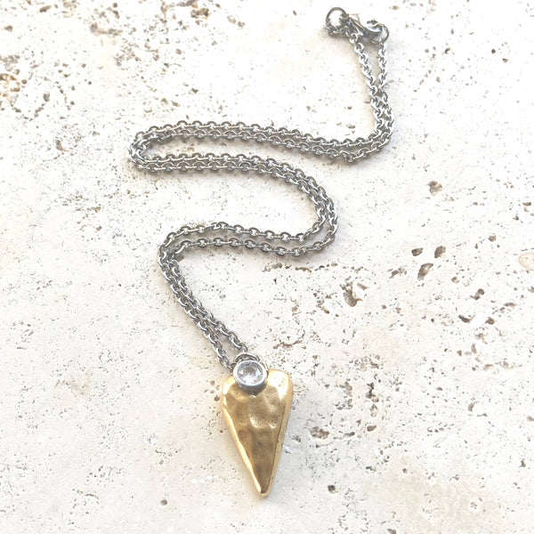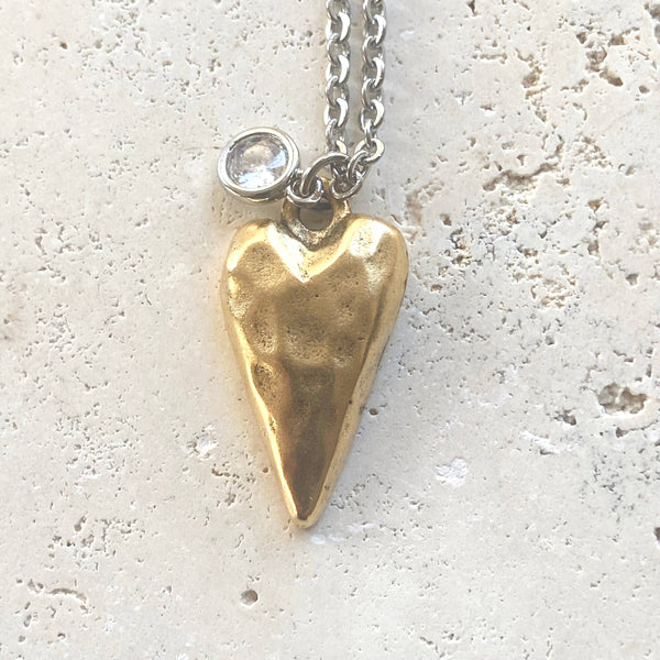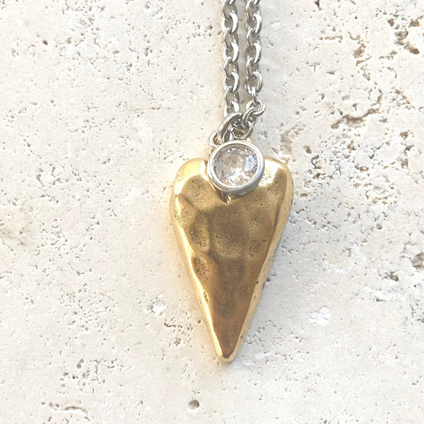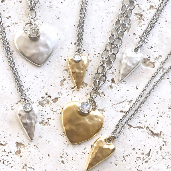 These are sure to be a hit with your customers! These little hammered hand casted hearts are so cute and fun to style with just about anything. This necklace has a sparkly clear crystal charm accent. The stainless steel chains are non tarnishing