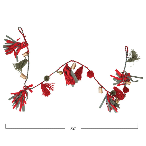 72"L Metal Bells Garland w/ Pom Poms, Tassels & Fabric Remnants, Multi Color